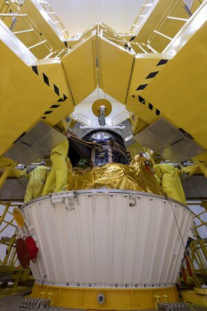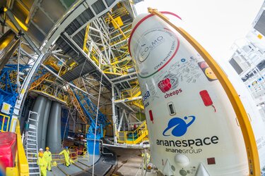 Over this period, the fully integrated and fuelled spacecraft was fitted inside the flight adapter of the Soyuz-Fregat rocket, encapsulated within the half-shells of the transport module, transferred to the final integration building, and installed on top of the Fregat upper stage of the Soyuz launcher. The upper composite, enveloped by the rocket fairing and comprises the Fregat and all passengers – the ASI Cosmo-SkyMed Second Generation satellite, Cheops, and three CubeSats: ESA’s OPS-SAT and CNES's EYE-SAT and ANGELS satellites – was eventually transferred to the launch pad area and hoisted on top of the three-stage rocket ahead of liftoff.
