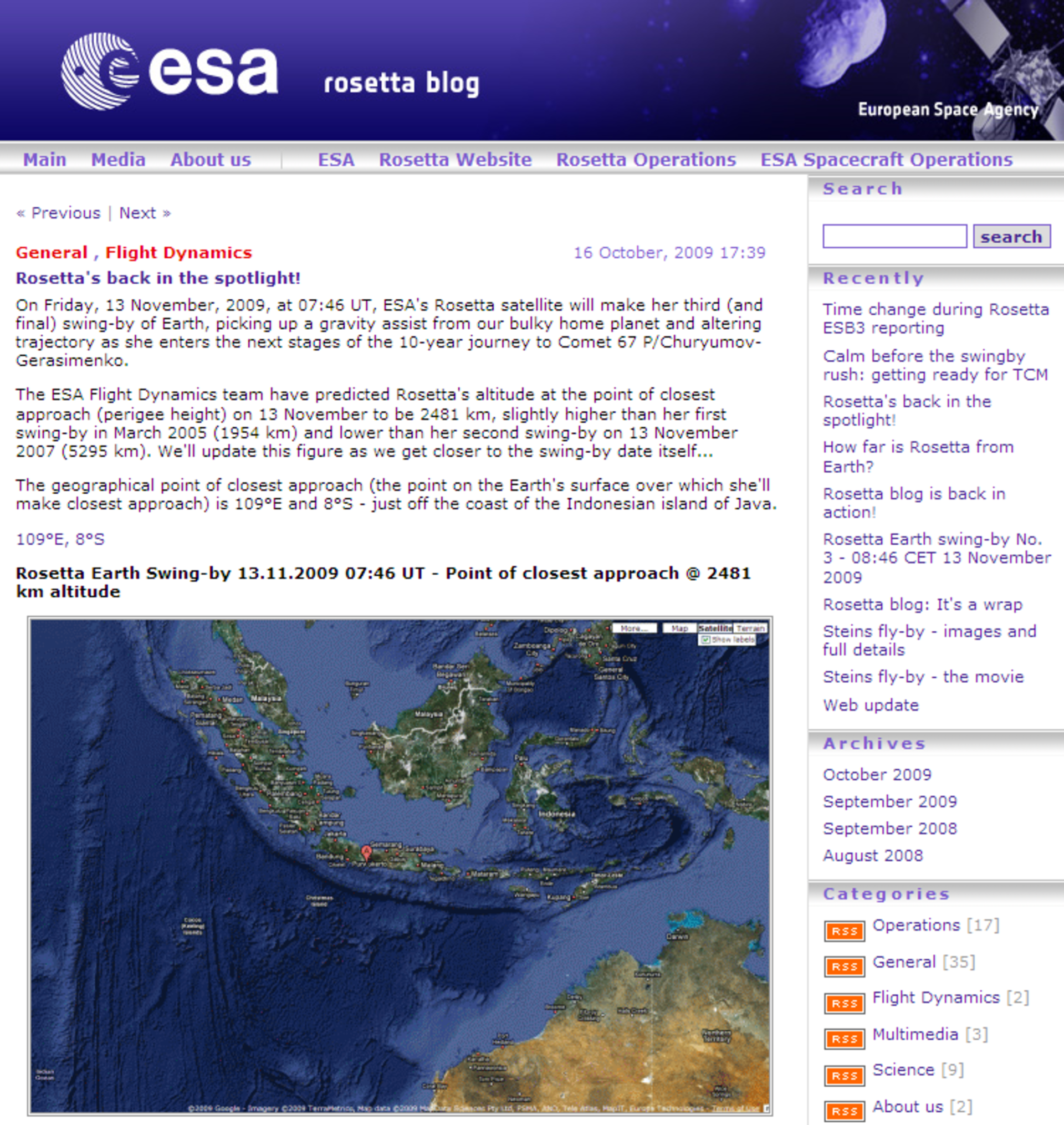 The Rosetta Swing-by Blog is now online, and will run through to 15 November 2007 to cover the approach, swing-by and departure of Rosetta - ESA's 'Comet Chaser' - past Earth.