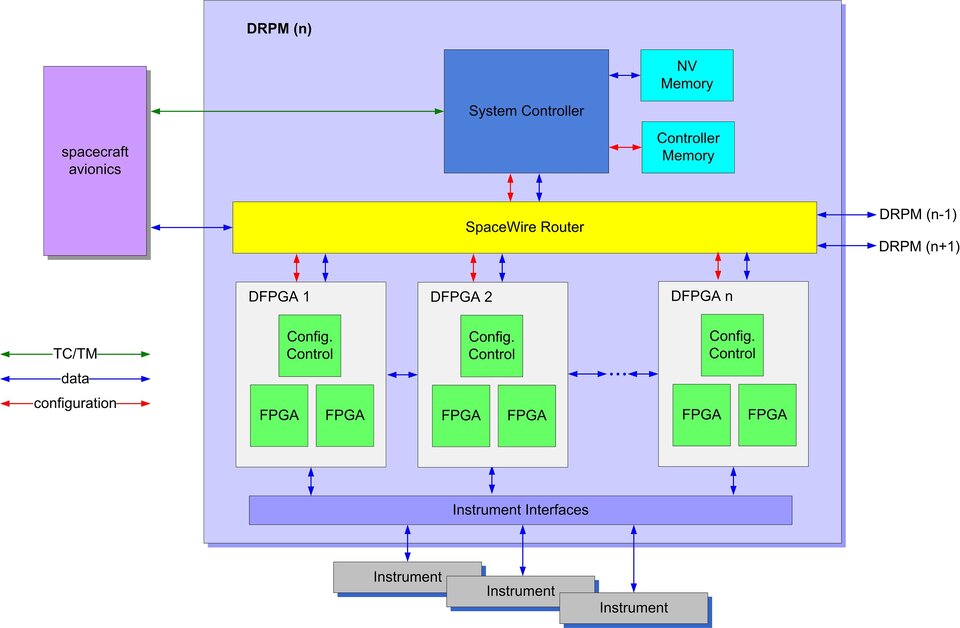 The project aim is to raise the TRL of on-board processing using reconfigurable SRAM-based FPGAs by building a technology demonstrator. The three main objectives are: (1) The specification, design and manufacture of a breadboard DRPM. The design is generic, applicable to a wide variety of mission payloads requiring high processing capacity, with the additional benefit of run-time full or partial reconfiguration. The breadboard uses commercial grade equivalents of flight qualifiable parts, with direct mapping to a rad-hard by design (RHBD) flight unit. The reconfigurable FPGAs are partitioned into user application areas which interface to IDA’s SoCWire network-on-chip in the static area of the FPGA. This ensures that partitions can be individually reconfigured without affecting the operation of other partitions. (2) Implementation of a prototype Application Development Environment (ADE), this being the set of processes and software tools which would be made available to application developers to build and test their instrument data processing applications which will run as user applications on the DRPM. (3) Use of the prototype ADE to develop a set of benchmarks, selected to be representative of typical payload processing applications, and then to quantify the breadboard performance through a series on benchmarking tests.