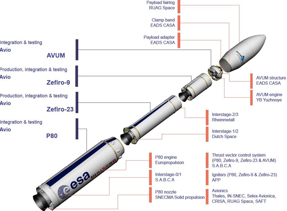 The industrial prime contractor of the launch vehicle was ELV SpA, 30% of which was owned by ASI and 70% by Avio SpA, including more than 40 European subcontractors. Italian company Vitrociset was the prime contractor for the ground segment.