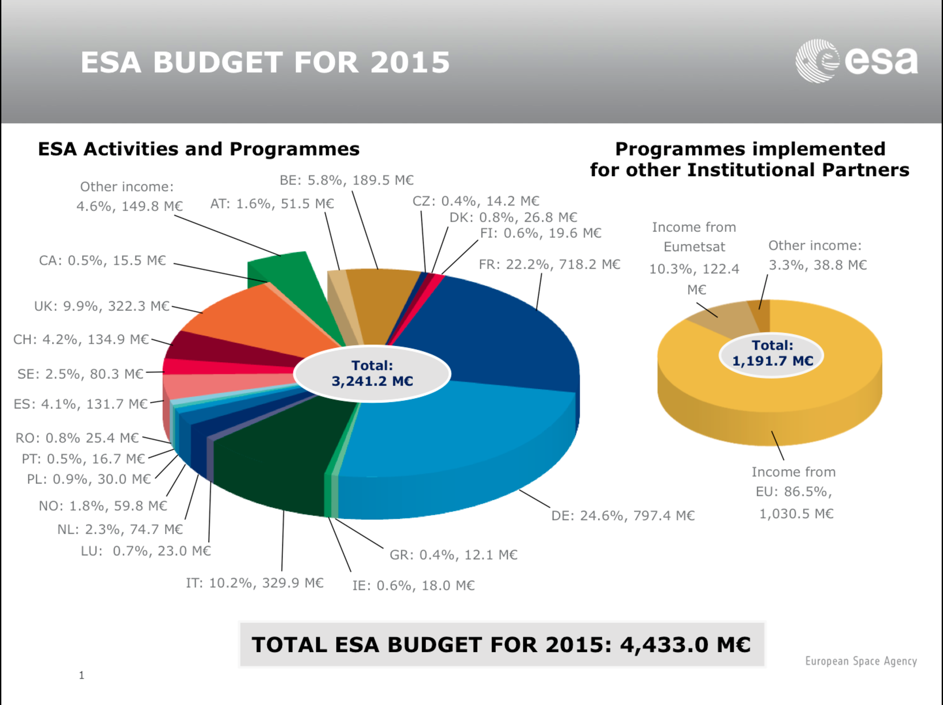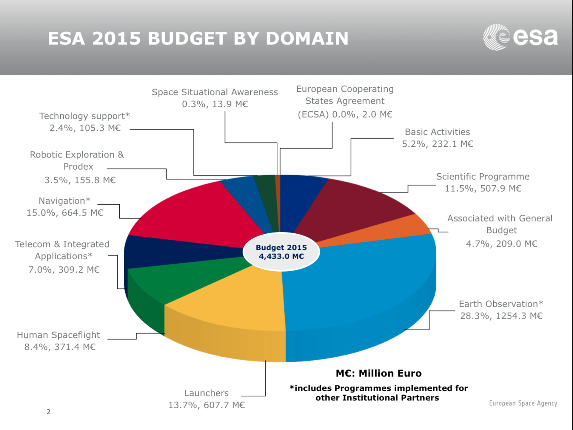 Agency ESA budget 2015 15/01/2015 18606 views ESA / Newsroom / Highlights Total ESA budget for 2015 and ESA budget by domain for 2015, in millions of Euro (M€).