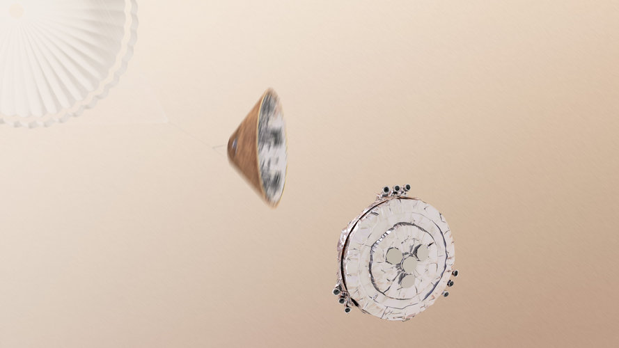 Schiaparelli with parachute deployed and front shield jetti…
