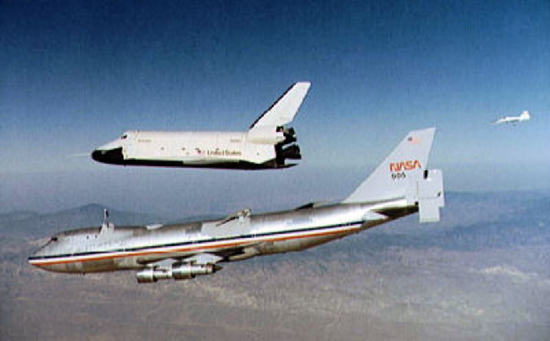 Atmospheric test flights by Enterprise at Edwards Air Force Base in California (from the top of the Boeing 747 Shuttle Carrier Aircraft):