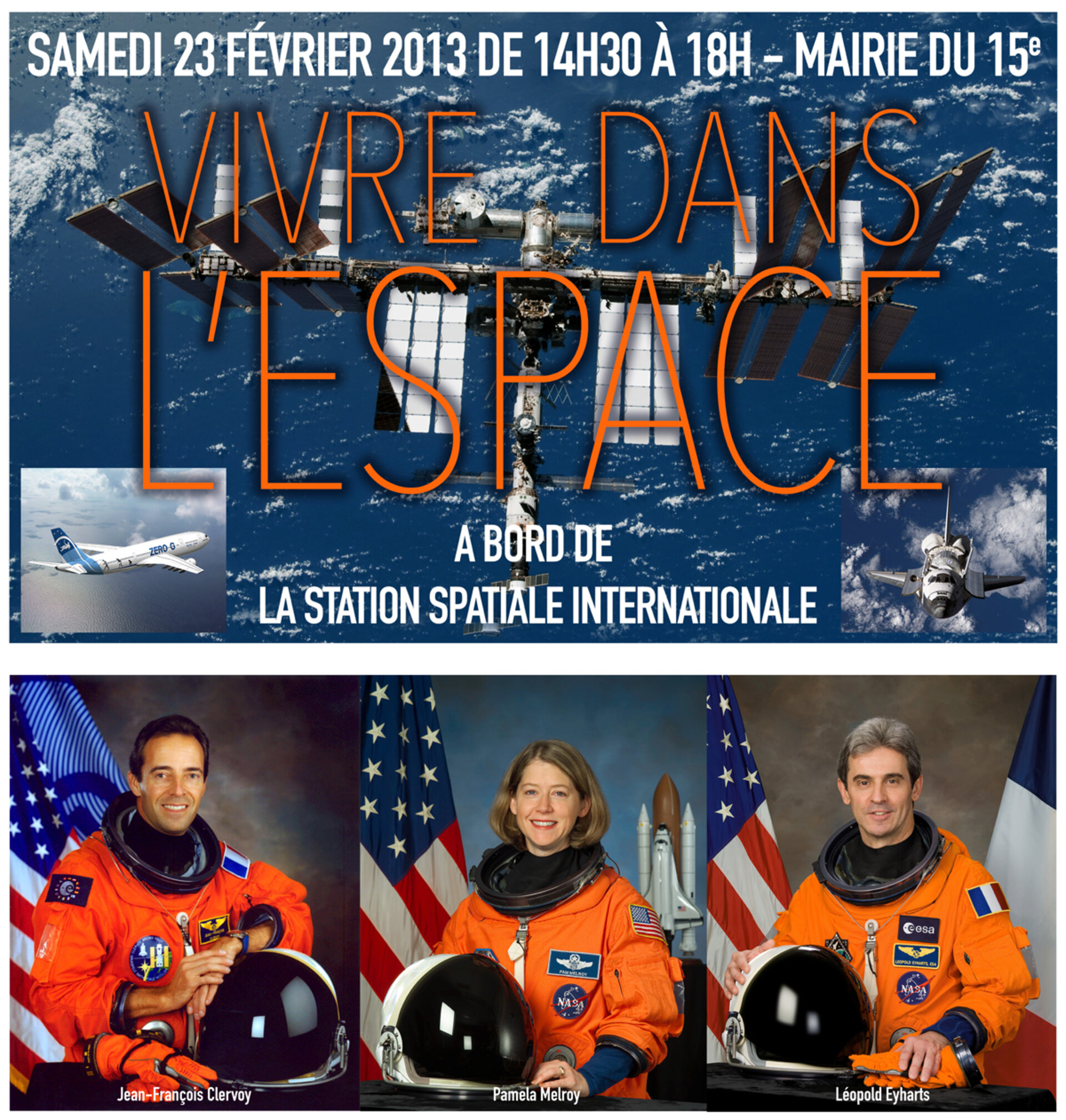 Organisé par l'ESA, le Club Apollo, la Mairie de Paris 15ème et l'association 3AF, cet événement aura lieu à la Mairie de Paris 15ème, 31 rue Peclet (Métro Vaugirard) le samedi 23 février 2013 de 14h30 à 18hh00. Venez en famille et avec vos amis.