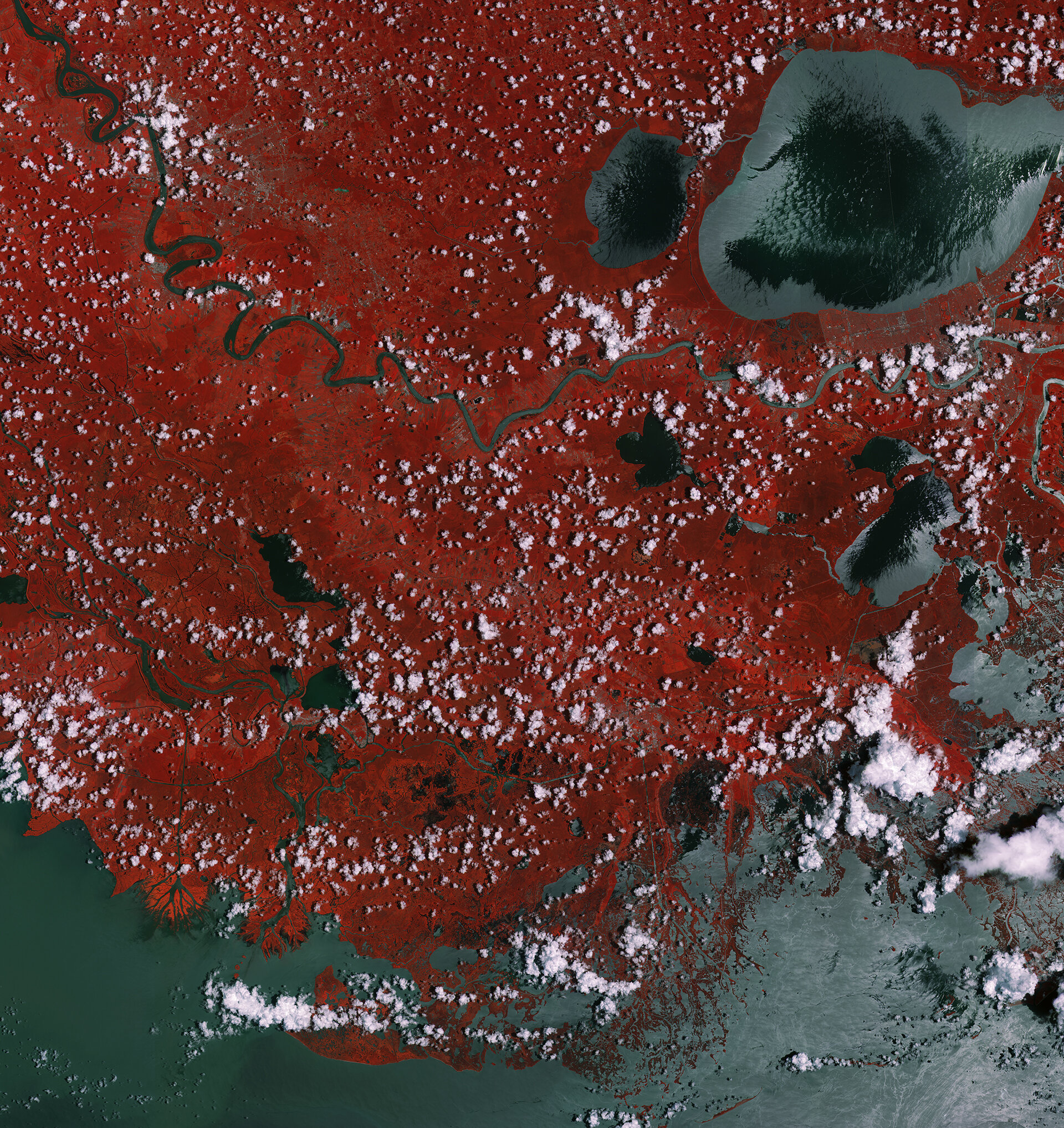 Verso la parte in alto a sinistra dell'immagine, sotto un raggruppamento nuvoloso, si trova Baton Rouge, capitale della Louisiana e sua seconda città per estensione. Situata sulla riva est del Mississippi, Baton Rouge è un importante centro industriale, petrolchimico, medico, di ricerca, cinematografico e di tecnologia in crescita, degli Stati del Sud dell'America. Il porto di Baton Rouge è il nono porto più grande negli Stati Uniti in termini di tonnellate di traffico spedito.