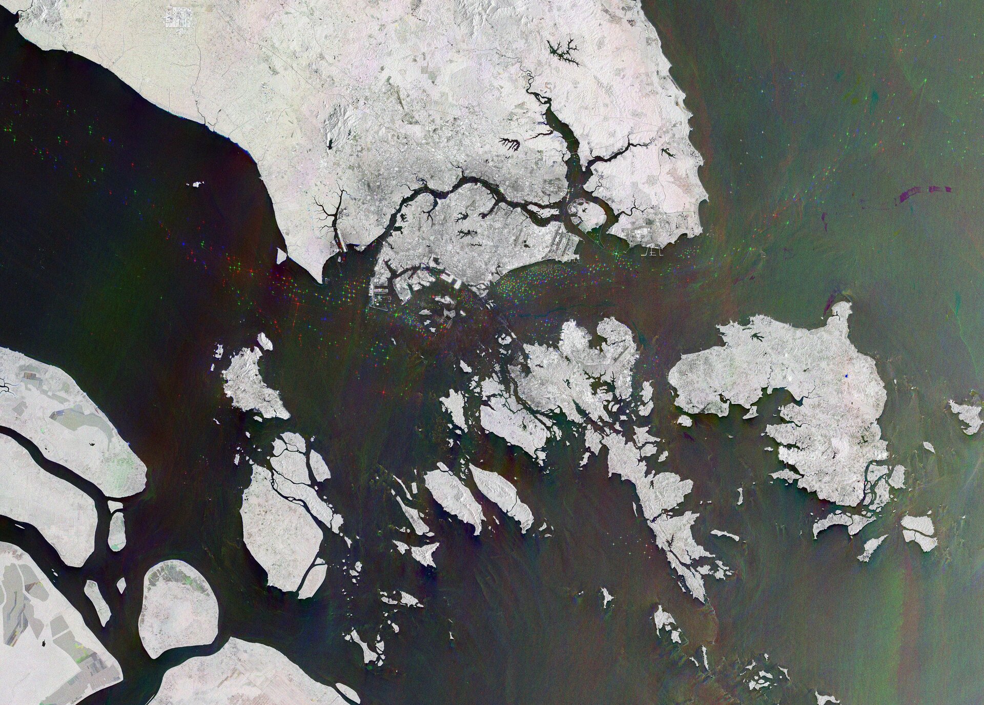 Questa Immagine della Settimana contiene l'unione di dati satellitari provenienti da tre scansioni radar separate, per evidenziare i cambiamenti avvenuti tra le diverse acquisizioni. La superficie del mare riflette il segnale radar lontano dal satellite, facendo apparire l'acqua di colore scuro nell'immagine, e contrasta con gli oggetti metallici – in questo caso navi e imbarcazioni, che appaiono come punti luminosi e scintillanti nell'acqua scura.