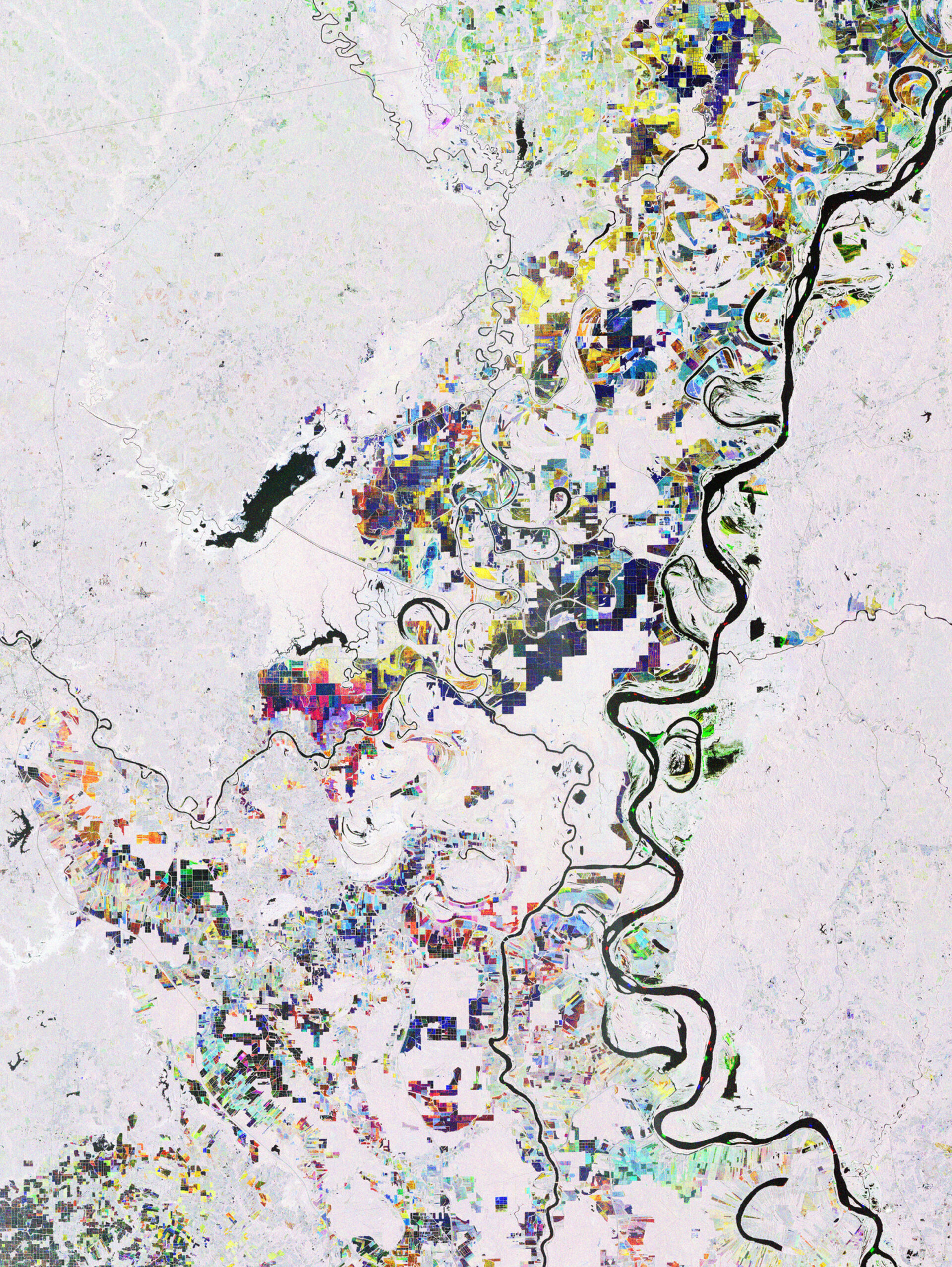 L'area presentata nell'immagine mostra la regione in cui il Mississippi viene a trovarsi a cavallo tra gli Stati della Louisiana e del Mississippi. L'immagine combina tre acquisizioni radar della missione Sentinel-1 effettuate a distanza di 12 giorni allo scopo di evidenziare i cambiamenti nel tempo delle coltivazioni e delle condizioni del suolo. I colori chiari nell'immagine indicano cambiamenti sul terreno occorsi tra una acquisizione e l'altra.