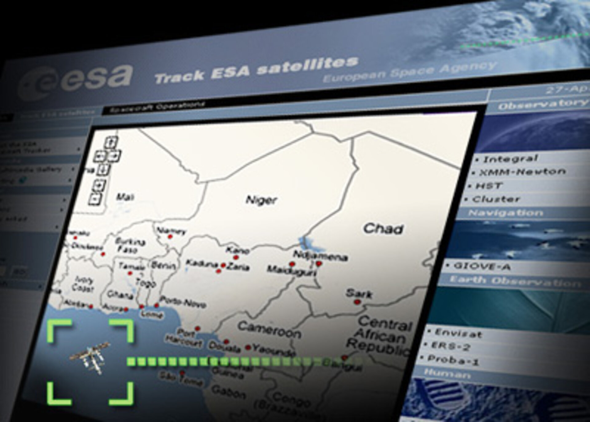 Der ESA „Spacecraft Tracker“ vereint Echtzeitdaten über Satellitenpositionen mit Kartenmaterial von Google Maps zu einer dynamisch aktualisierten Darstellung des Flugwegs verschiedener ESA- und Partner-Missionen über dem Boden. Verfolgen Sie den Umweltsatelliten Envisat, die ISS oder das Hubble Teleskop hier.